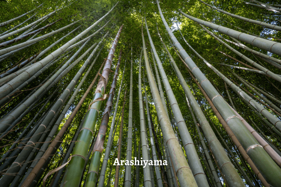 La bambouseraie d’Arashiyama est une véritable forêt d’immenses bambous, dont leurs cimes atteignent plusieurs dizaines de mètres de haut. Différents chemins permettent de s’immerger au cœur d’une ambiance reposante, presque magique. Cette dense forêt au vert intense, laisse filtrer les rayons de soleil par beau temps, et, lorsque le vent souffle, les bambous produisent un chant mêlé de bruissements, de sifflements et grincements.
