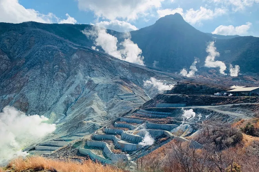 Partons à la découverte des paysages spectaculaires du Japon rural, au cœur de la région de Hakone. La journée commence par une ascension en téléphérique jusqu’au sommet du mont Komagatake, point culminant de la région. Par temps clair, le panorama est grandiose : les îles d’Izu, le lac Ashi, le littoral pacifique, et, en arrière-plan, la silhouette majestueuse du mont Fuji. Nous redescendons ensuite vers la spectaculaire vallée d’Owakudani, site volcanique encore actif, célèbre pour ses fumerolles sulfureuses et ses œufs noirs, cuits dans les sources chaudes et porteurs de longévité selon la tradition locale.
